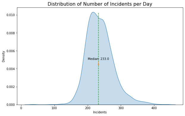 With the data cleaned, the next step was to understand more about what I was looking at. The plot on the right shows the distribution of incidents per day, the median of which is 233.