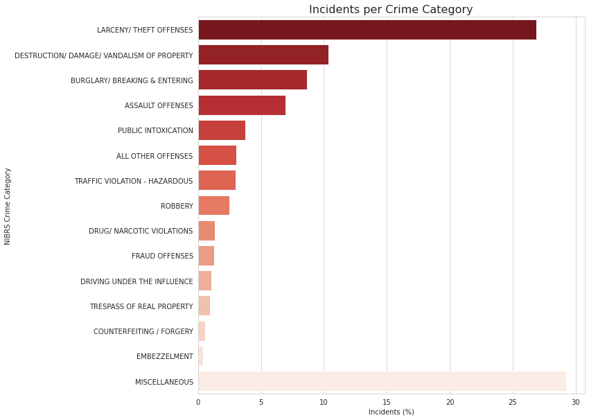 I next wanted to understand the types of crime that were occuring. To do this I had to learn how crime was even reported in the first place. It turns out there are multiple systems used. The first I encountered was the UCR, or "Uniform Crime Reporting" Program by the FBI. Its purpose is to generate reliable statistics to law enforcement. However, after looking at my dataset, it seemed like it would be much easier to use the NIBRS, or National Incident Based Reporting System, to classify and categorize the types of crime occuring. The figure on the right shows the 15 most committed crimes.